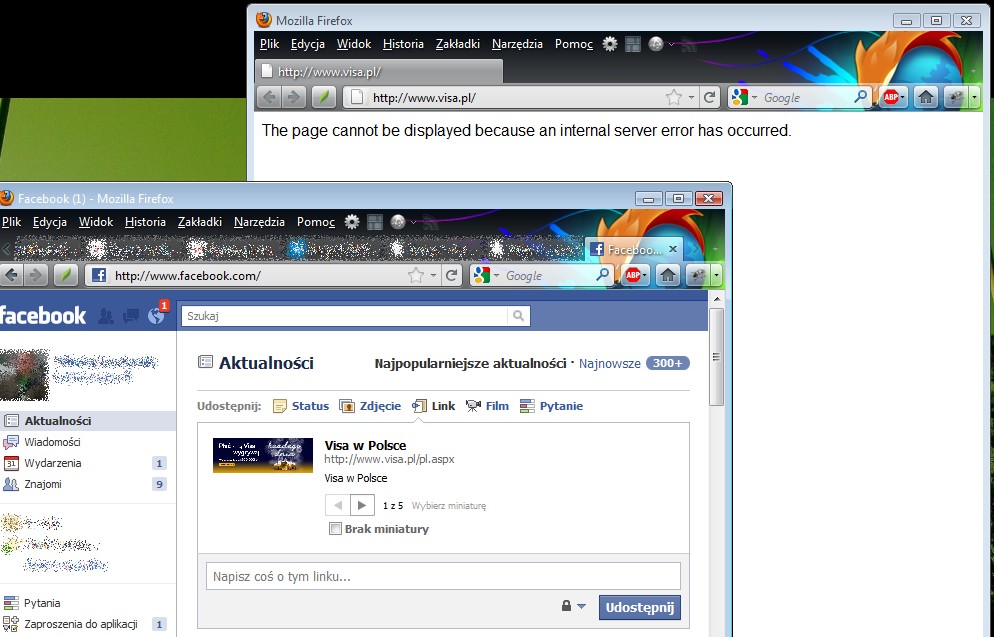 W artykule tym wskazuję "padnięty" serwer WWW hostujący witrynę jednego z kluczowych dostawców kart płatniczych www.visa.pl oraz ciekawostkę, że moduł "udostępnij" w facebook'u bazuje na cache'u stron WWW.