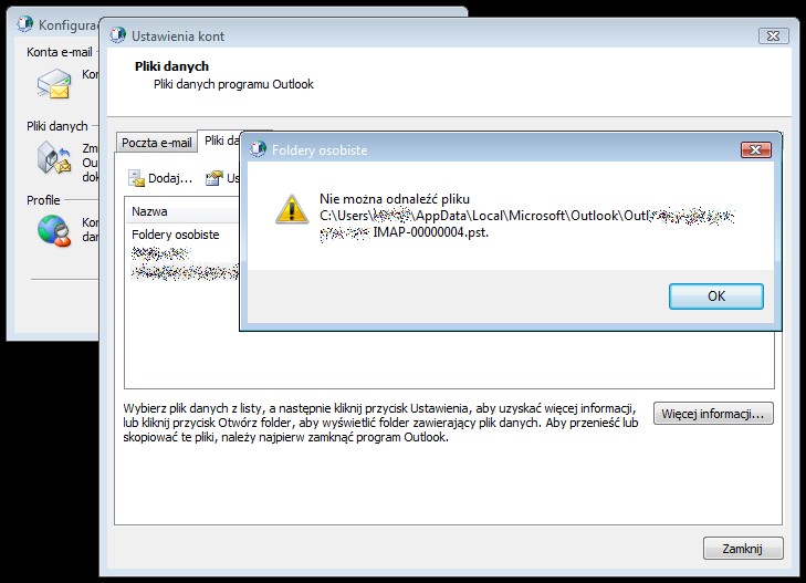 - Otrzymasz komunikat o błędzie "Nie można odnaleźć pliku…" → OK → wskaż własną lokalizację dla tego pliku .pst;
