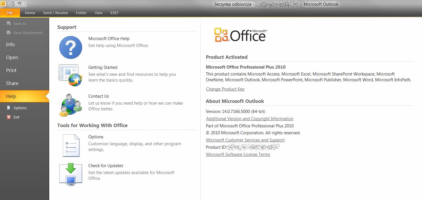 Z wstążki wybierz "File" (Plik) > "Help" (Pomoc) > w panelu po prawej stronie wyświetlone zostaną szczegóły wersji.