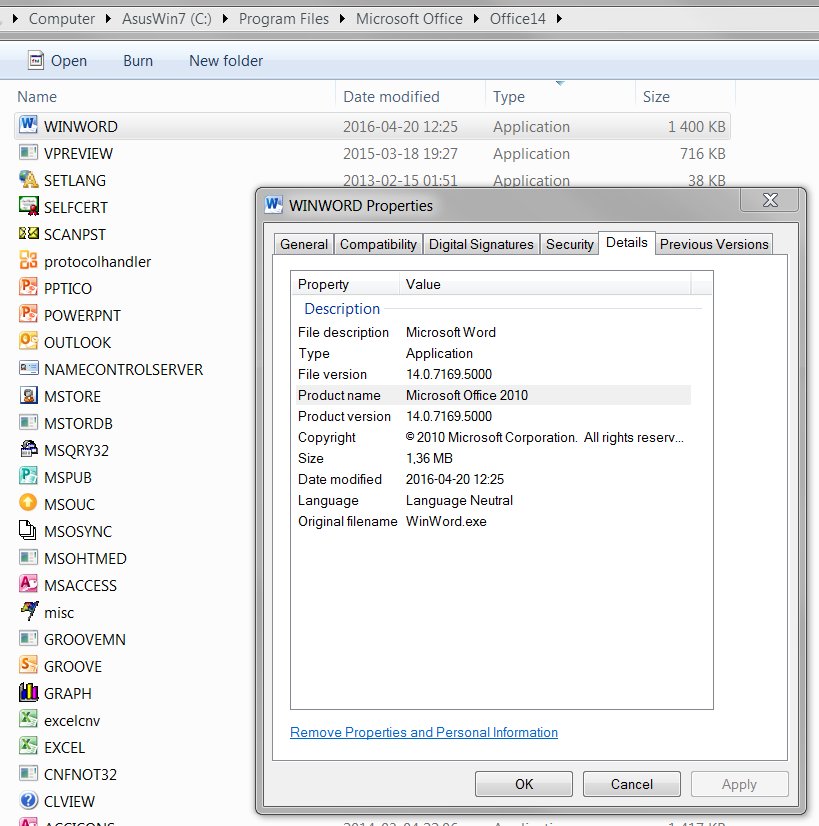 Jeśli nie jesteś przekonany czy nr w nazwie folderu "Office" stanowi odpowiedź, możesz też sprawdzić bezpośrednio wersje plików wykonywalnych (.exe) poszczególnych programów.
